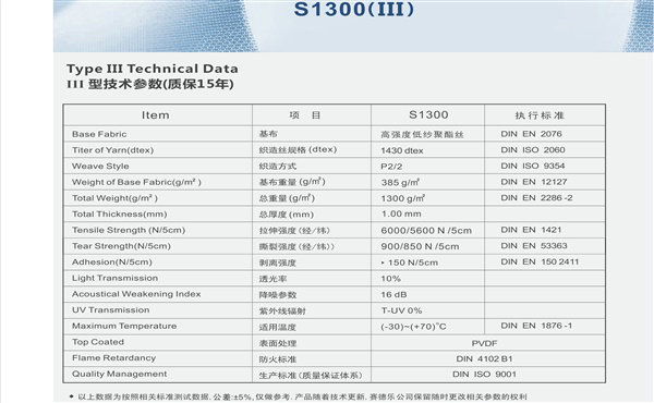 以上就是諾科膜結(jié)構(gòu)為您介紹的 德國進(jìn)口賽德樂膜材 S1300(III) 的全部內(nèi)容,希望能夠幫到您,如果您還對張拉膜相關(guān)的內(nèi)容感興趣,請持續(xù)關(guān)注本站.20年的膜結(jié)構(gòu)工程行業(yè)耕耘,近千個ETFE膜材|PTFE膜材|PVDF膜材的項目案例,專業(yè)的膜結(jié)構(gòu)設(shè)計,膜結(jié)構(gòu)加工,膜結(jié)構(gòu)安裝的經(jīng)驗是品質(zhì)的保障。